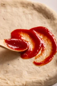 1. Rol het deeg uit en voeg een basislaag tomatensaus toe.
