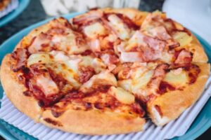 3. Verdeel de ham en ananas over de pizza.